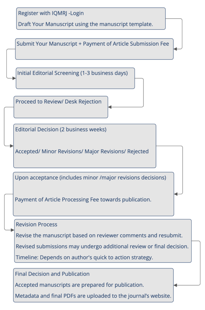 IQMRJ's mission is committed towards achieving global reach through major academic databases, ensuring rigorous peer review for impactful research, and promoting inclusivity by offering accessible fees to support diverse scholars and practitioners.